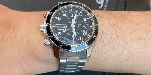 当初気になった104と105を試着されましたが、ちょっとイメージが違うとのことで556シリーズを試着。コックピットクロック由来の読み取りやすい3・6・9・12のアラビア数字に、ワンポイントとしての赤秒針が良いとのことで、556.A.RSをお選びいただきました。ありがとうございます。