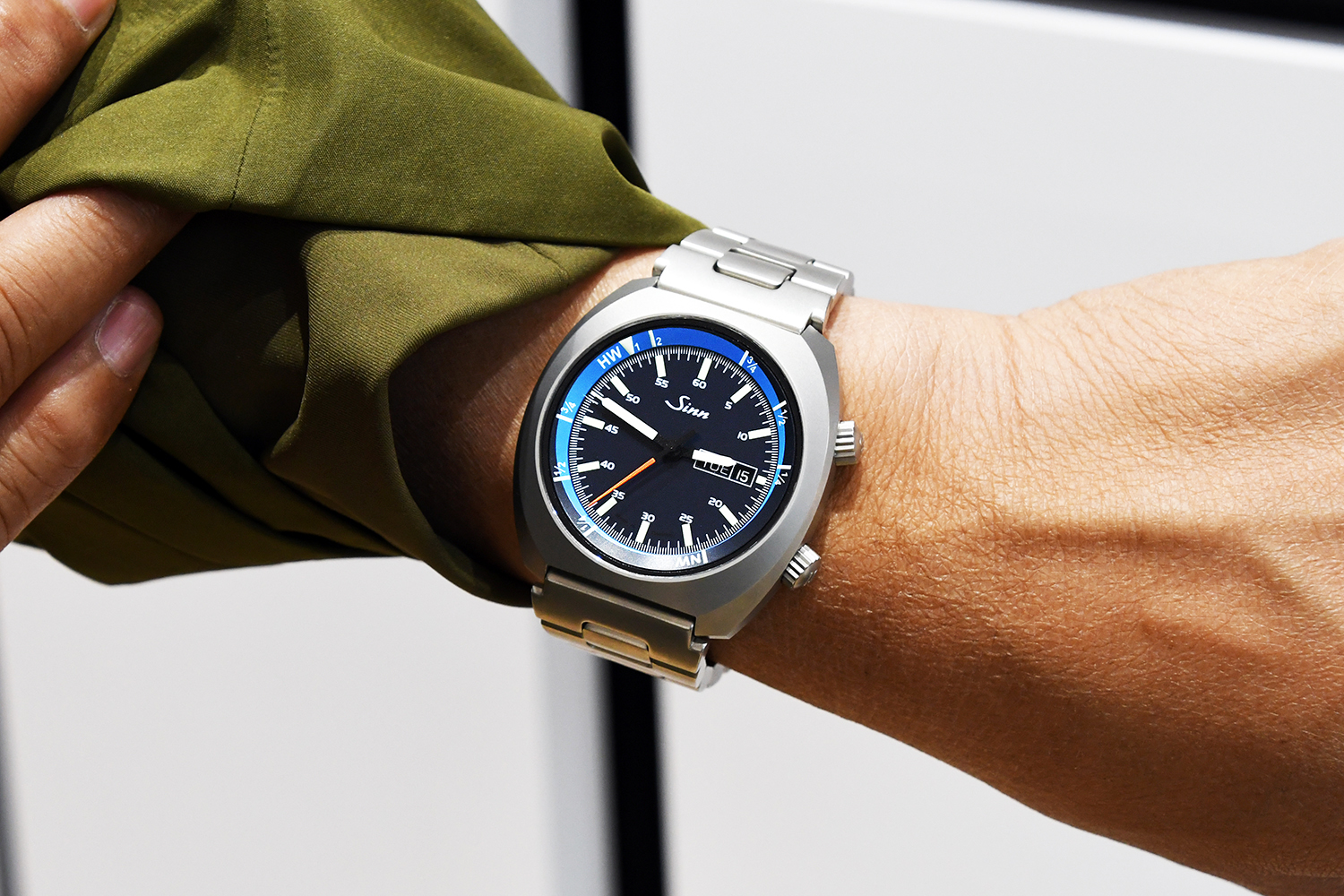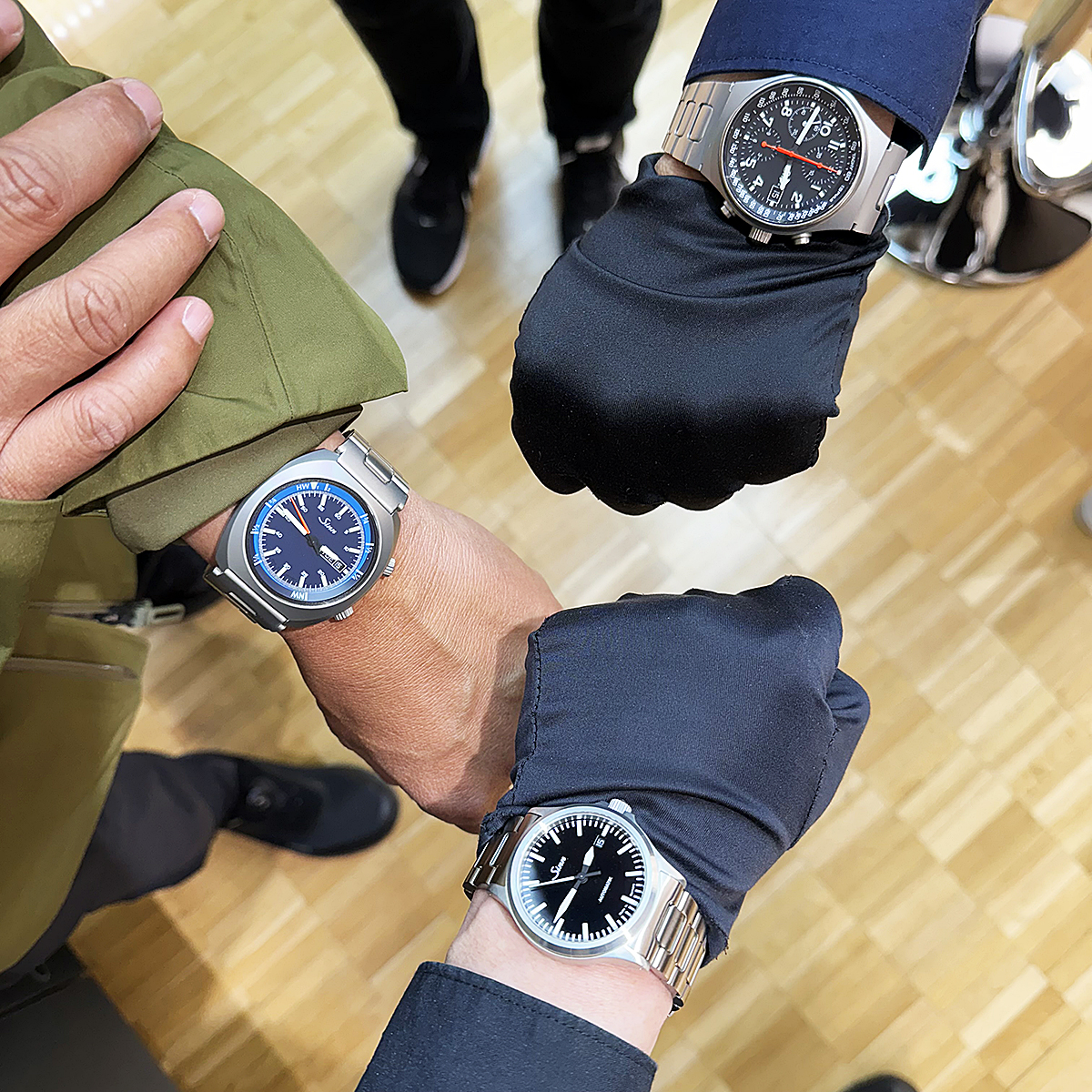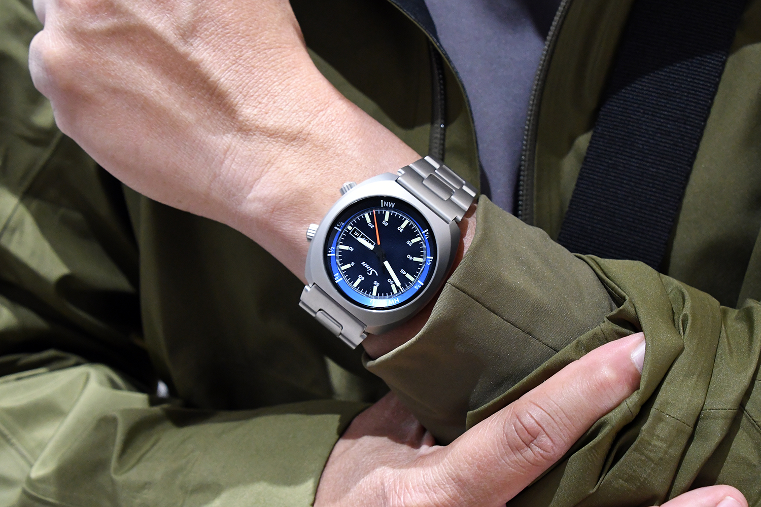一通りご覧になった後にモデル240の通常べセルとタイドメーターをご試着。タイドメーターの使用目的はご存知なかったのですが、ブルーが特徴的なベゼルデザインに惚れてタイドメーターモデルの240.ST.GZに決定に。