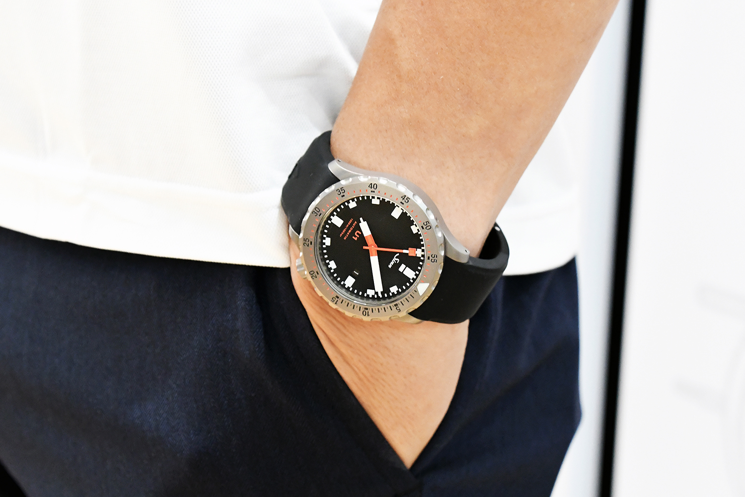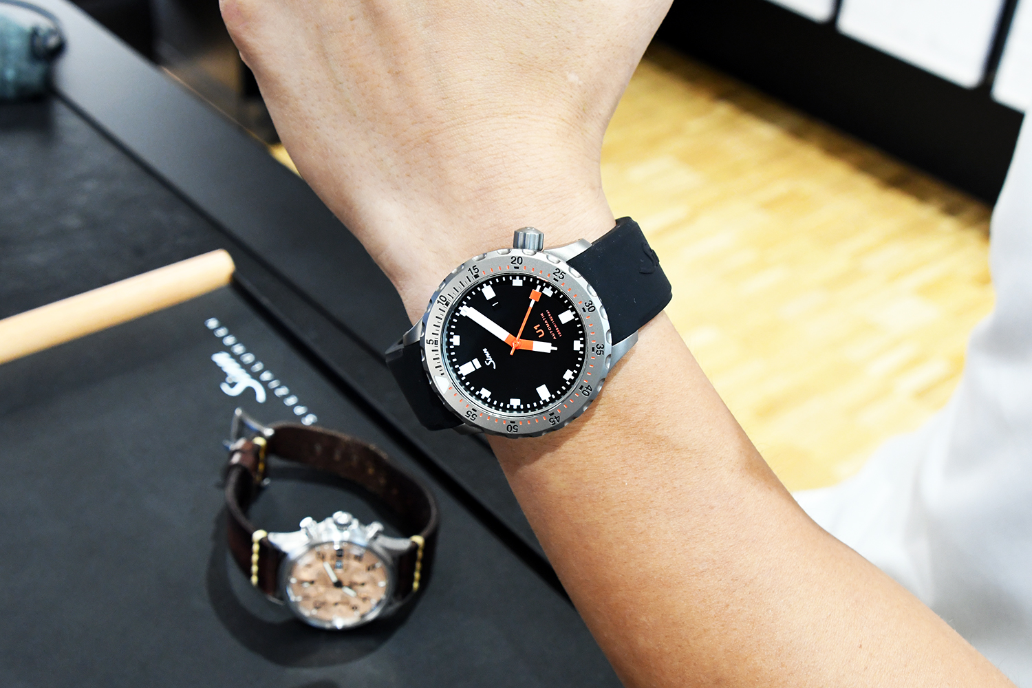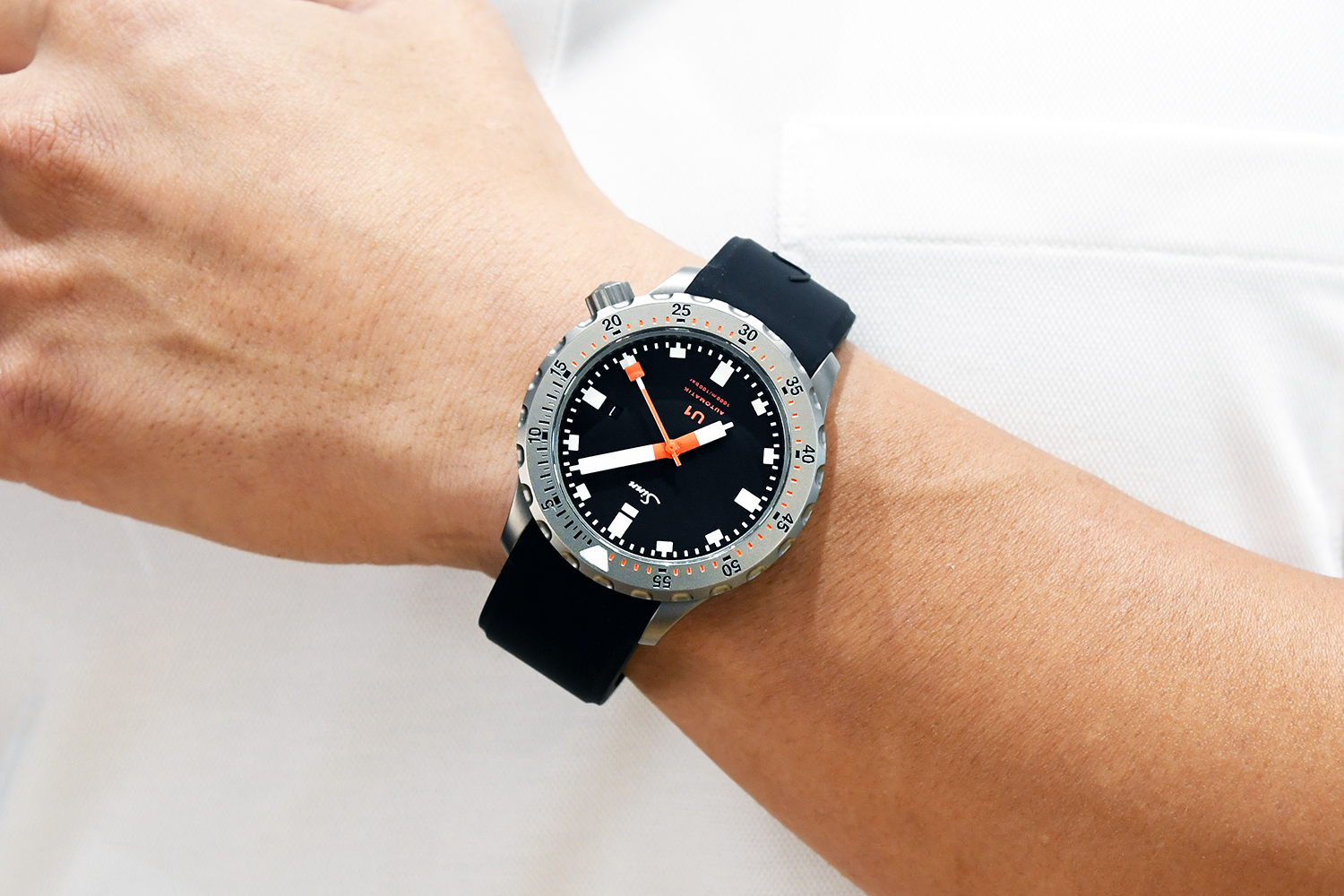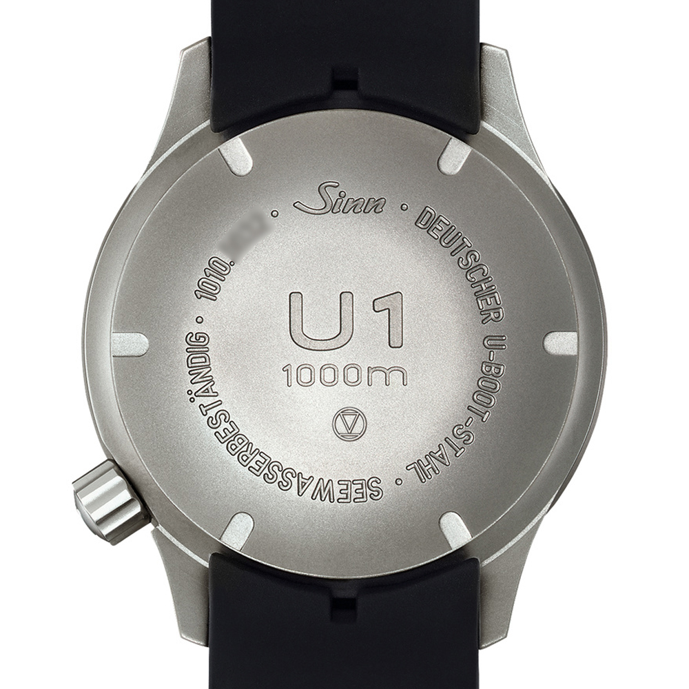レギュラーモデルのU1の時計ケースは、ご存知の通りSINN社独自の時計素材であるドイツ最新鋭潜水艦の鋼鉄Uボートスチールをに使用しています。これは海水耐性・耐腐食性が優れているだけでなく、残留磁気を帯びずに反磁気性があり、また表面硬度が非常に高い素材です。