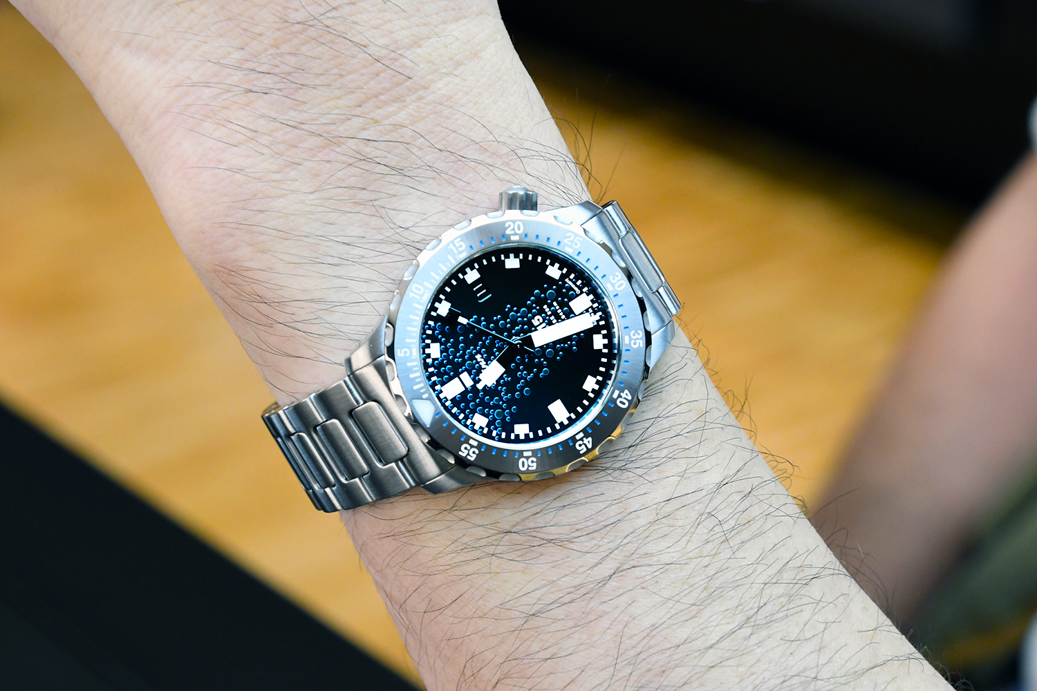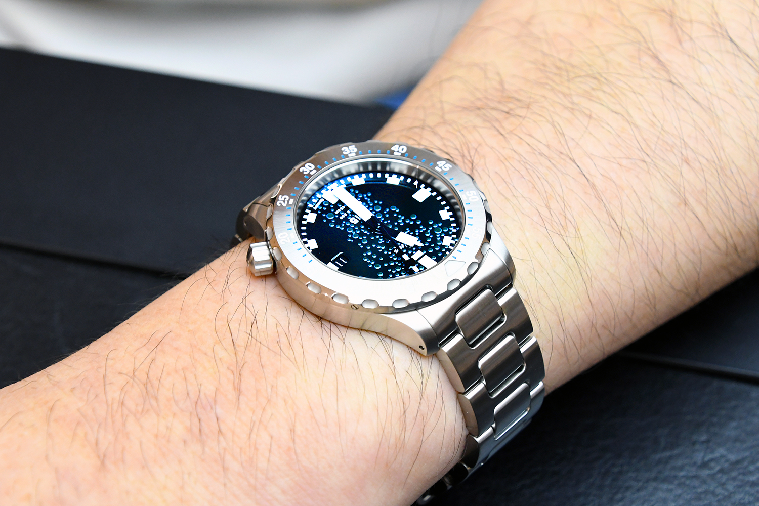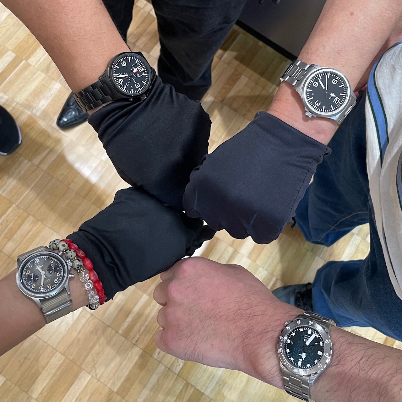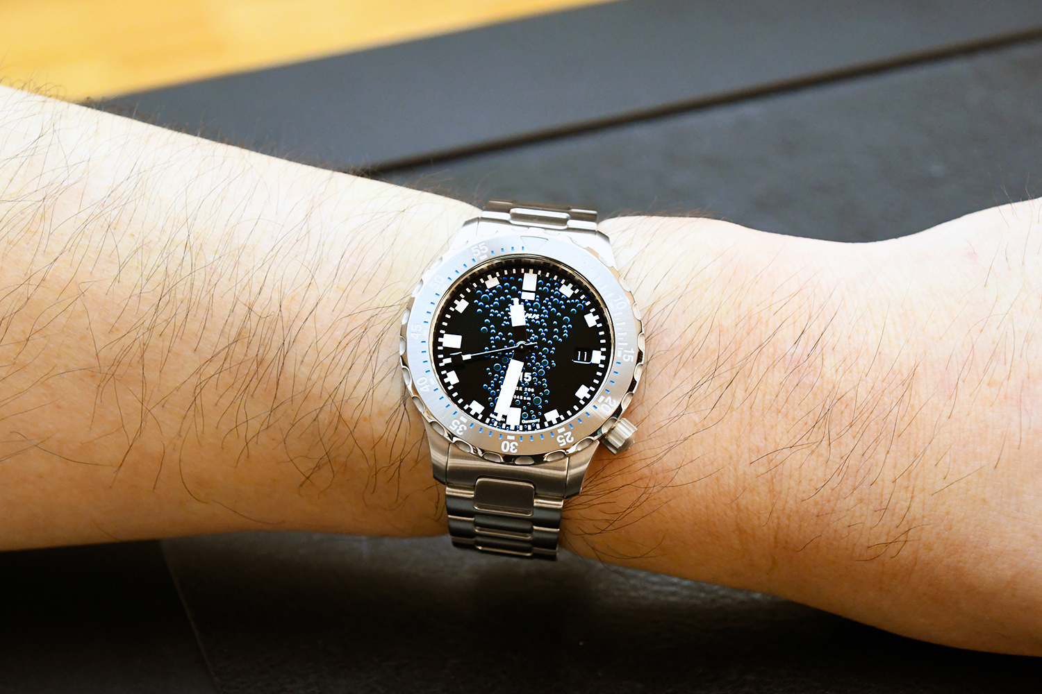 ジンが本物の潜水艦の鋼材を使っていることは以前からご存じのようで、U50を試着したことがあるそうです。今回ネットニュースでUシリーズの新作が出ることを知り、それが実際に活躍していたUボートの鋼材を使用していることがかなりグッと刺さったとそうです。時計を選ぶアプローチにも様々な思いがあることを教えていただきました。