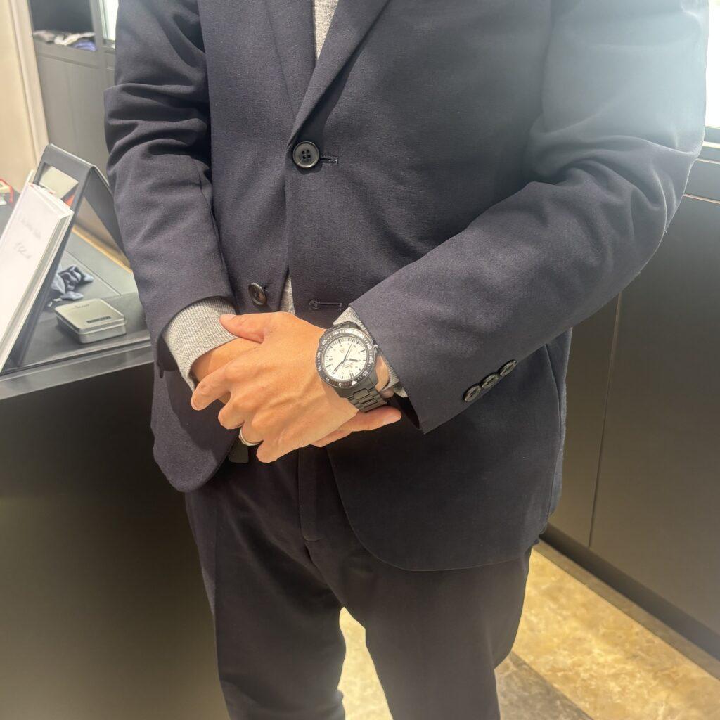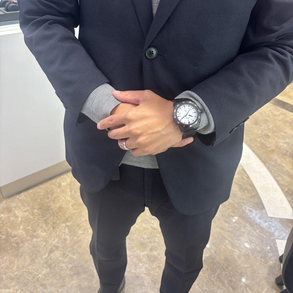 こちらは男性スタッフの着用写真です。暗めの色のスーツを着ると、ダイヤルのホワイトがより際立っています!とても視認性がよく、業務中も素早く正確に時間を読み取ることができそうです。