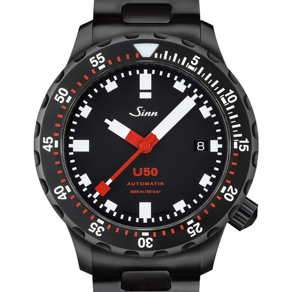 これまでのモデルU1の直径44mmから、ダウンサイジングされたモデルU50の直径41mmのケースサイズが特徴で、ダイバーズウォッチにとって必要不可欠な要素のみに特化したシンプルな設計コンセプトが特徴です。オールブラックの中にハイライトの白と、赤いポイントが印象的な配色です。ケースとリューズには他のUシリーズ同様に、海水耐性に強いドイツの最新鋭潜水艦の鋼鉄であるUボート・スチールを採用し、テギメント・テクノロジーを使用したブラック・ハード・コーティングを施しています。Uボート・スチールは、高い強度と非磁性特性だけでなく、海水への高い耐性でも際立っています。逆回転防止ベゼルは特殊結合方式によりケースに取り付けられ、表面を硬化させるテギメント・テクノロジーを採用し、傷がつくのを防ぎます。手の甲に当たらないようリューズは4時位置に装備しています。DNV GLにより、50気圧の耐圧性、およびヨーロッパの潜水器具規格に準拠した耐温度性と機能性が検査・認定されています。