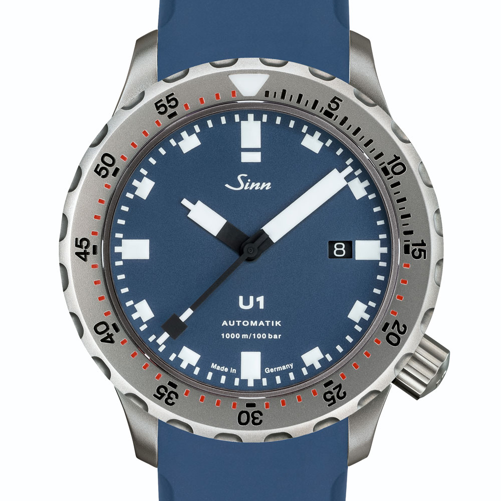 ブルーの文字盤にホワイトのインデックスと時・分針、そしてブルーのシリコンストラップが印象的なモデルU1.Bです。もちろんジンならではの高い視認性も保証されています。強い衝撃でも外れることのない特殊結合方式によって固定された逆回転防止ベゼルには高い耐傷性を誇るテギメント加工が施されています。リューズは通常の3時位置ではなく、装着感を高めるために4時位置に取り付けられているため、手の甲に当たるといったことがありません。ジンの他のUシリーズ同様に、船級・認証機関DNV GLは、このモデルの耐圧性能を1,000mの潜水深度まで保証し、その温度耐性と機能性を欧州潜水器具規格(EN250およびEN14143)に準じて検査・認証しています。